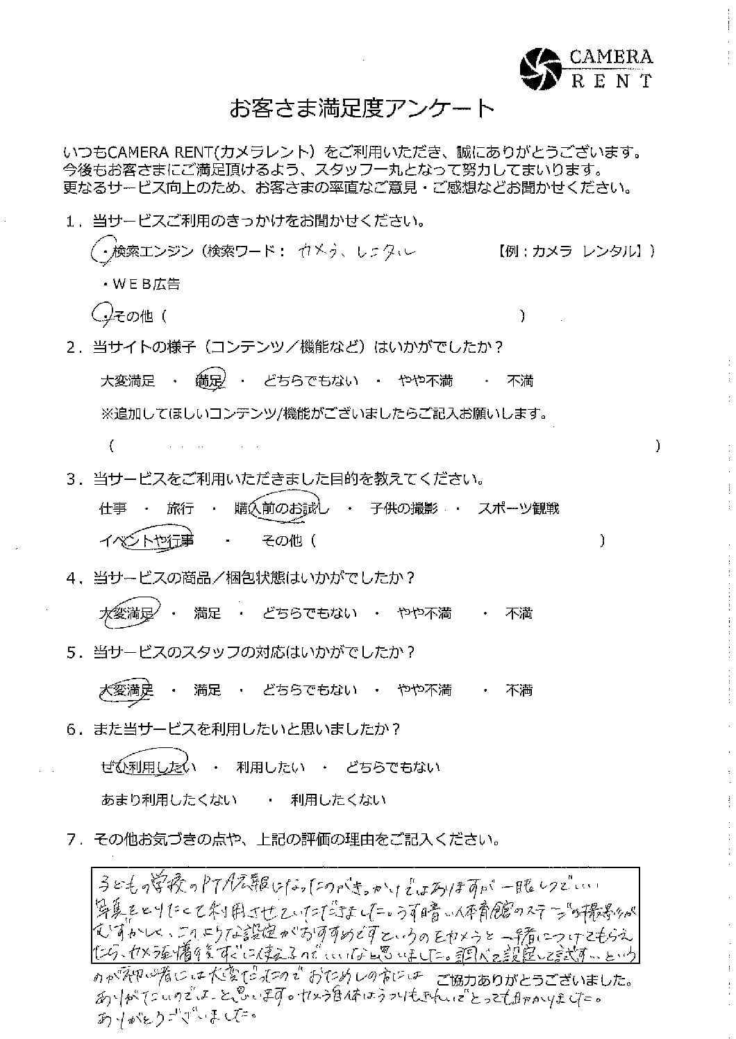 薄暗い体育館のステージの撮影が難しく、このような設定がおすすめですというのをカメラと一緒につけてもらえたら、カメラ到着後にすぐに使えるのでいいなと思いました。調べて設定して試すというのが初心者には大変だったので、お試しの方にはありがたいのではと思います。