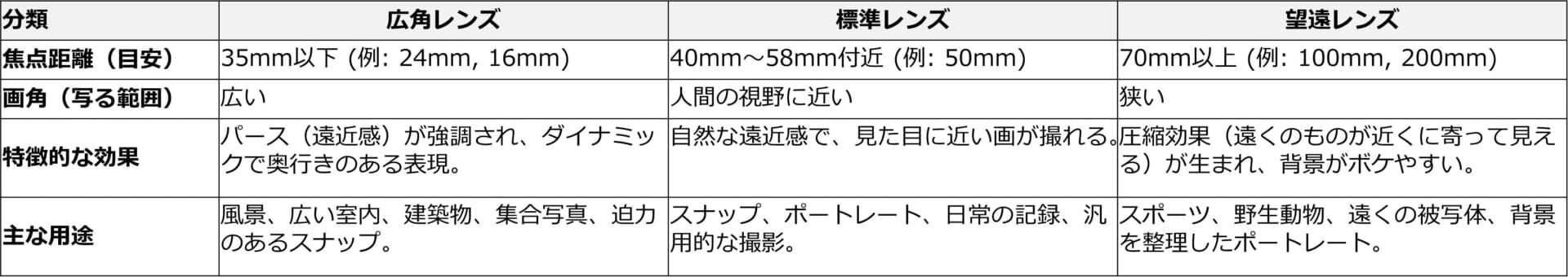 それぞれの特徴を押さえることで、撮影目的に合うレンズを見つけやすくなります。