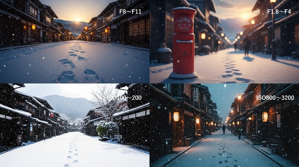雪景色をきれいに撮影するためには、絞り値(F値)とISO感度の設定も重要なポイントです。