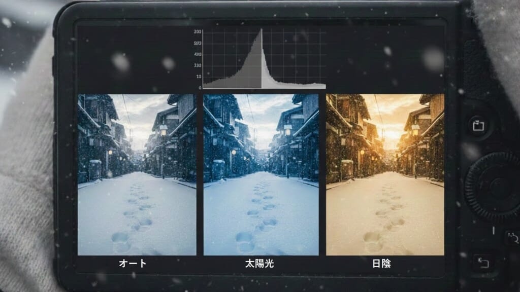 雪の色合いを意図的にコントロールしたい場合は、ホワイトバランスを手動で調整すると良いでしょう。