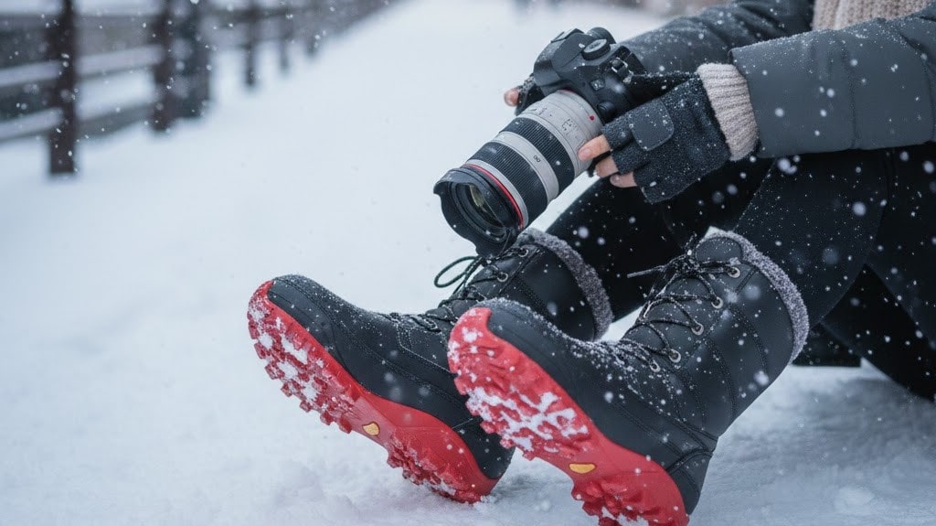 撮影時は、スニーカーではなく、滑り止め付きのスノーブーツや防滑仕様の靴を選びましょう。