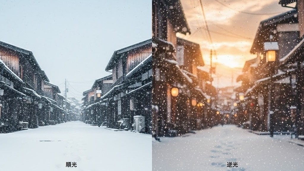 特に逆光気味の光では、雪の粒がキラキラと輝き、幻想的な雰囲気を演出しやすくなるでしょう。