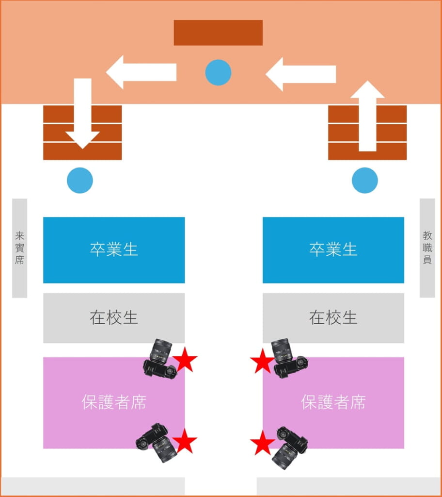 会場の設営にもよりますが、一般的な卒業・卒園式の流れに沿った「狙い目」のポジションを把握しておきましょう。