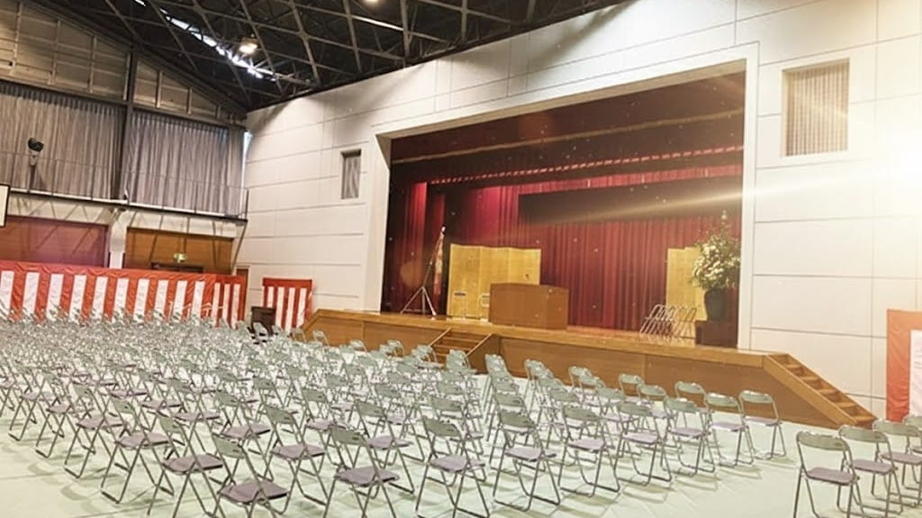 体育館の後方席からの証書授与、広い会場での入場シーン