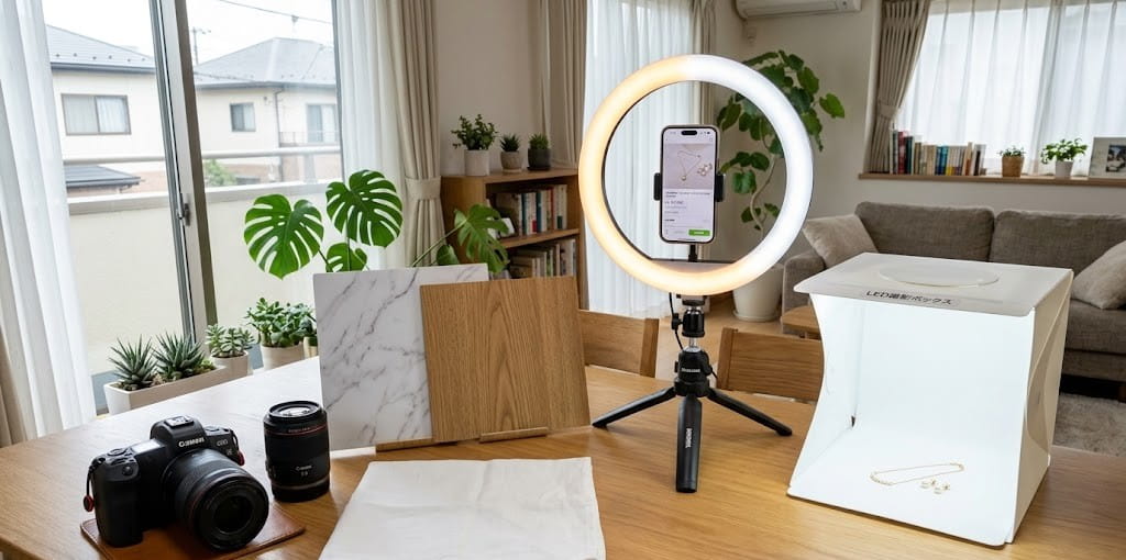 - 撮影ボックス(簡易スタジオ):小物中心の出品者なら、LED内蔵の撮影ボックスが最強です 。箱の中に置くだけで背景と照明が整うため、初心者でも安定したクオリティを量産できます 。